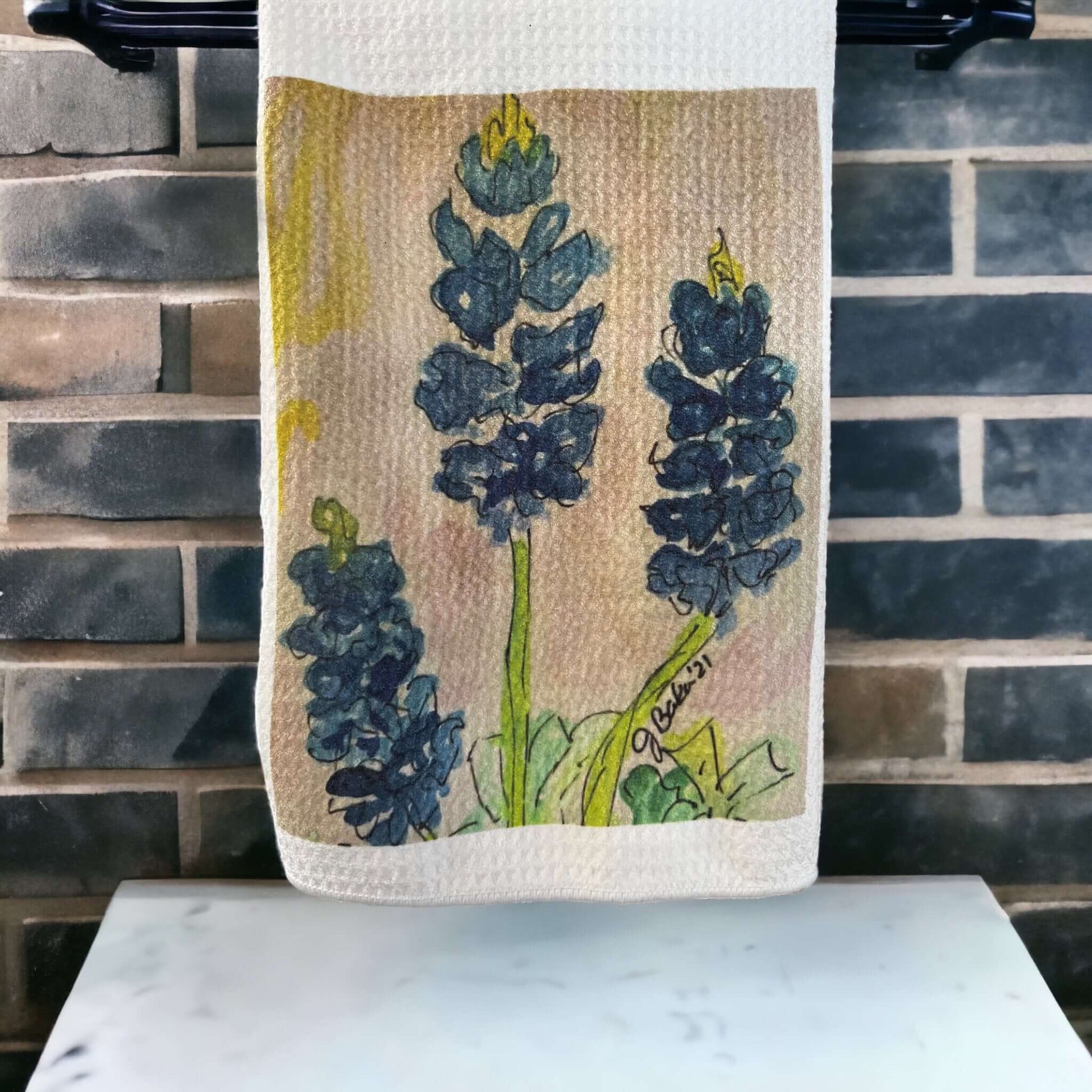 Soft and absorbent waffle knit kitchen towel. 16 x 24 microfiber towel is machine washable and durable. Based on original watercolor artwork by Julie Baker.