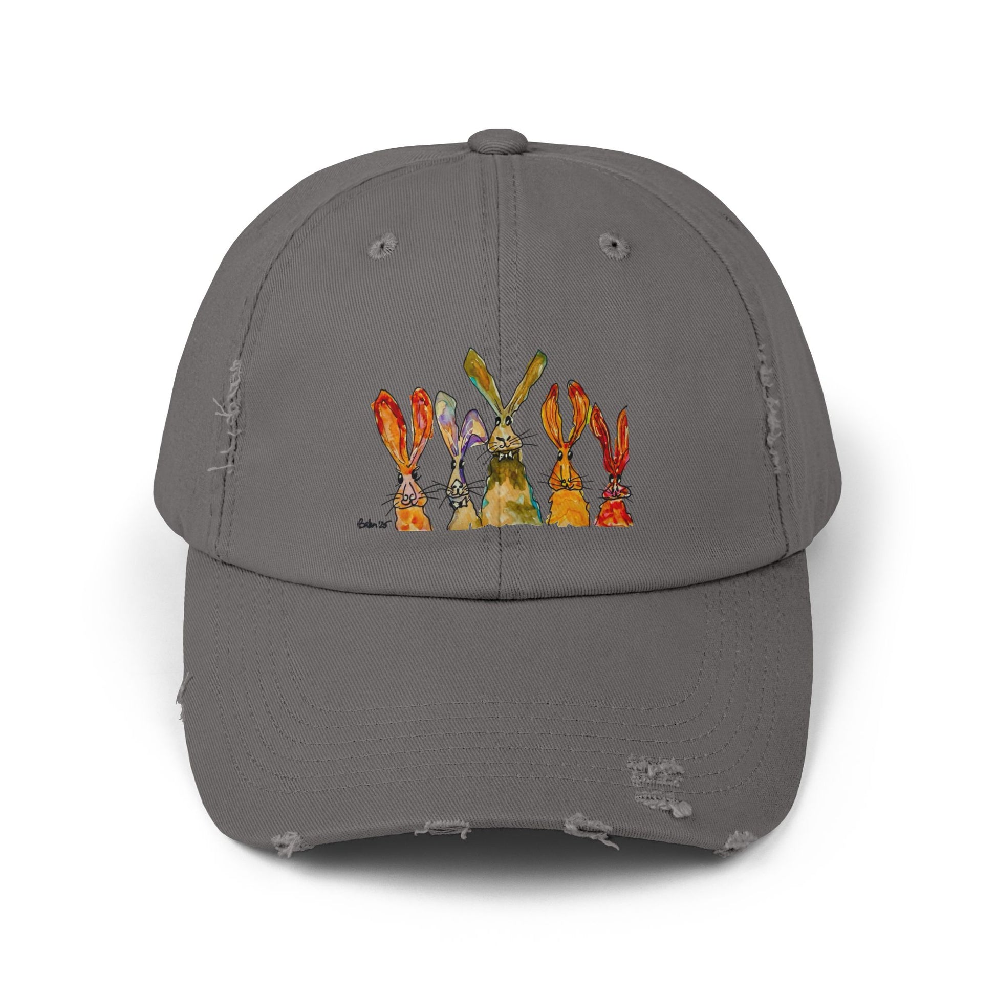 Weathered and warm, this distressed cotton cap carries a small row of watercolor-style bunnies across the front — gentle, whimsical, and quietly playful. The low-profile, unstructured silhouette sits easily on the head for everyday wear, while the faded finish and intentional frays lend a worn-in feel that ages beautifully. Lightweight cotton twill breathes well on sunny days. A hidden fabric strap with a metal D-ring lets you fine-tune the fit, and the printed art uses Direct-to-Film for crisp, painterly color that still feels soft. Wear it while wandering neighborhood streets, tending garden beds, or keeping sun off your face at casual gatherings — it brings a relaxed, handmade vibe to simple moments.