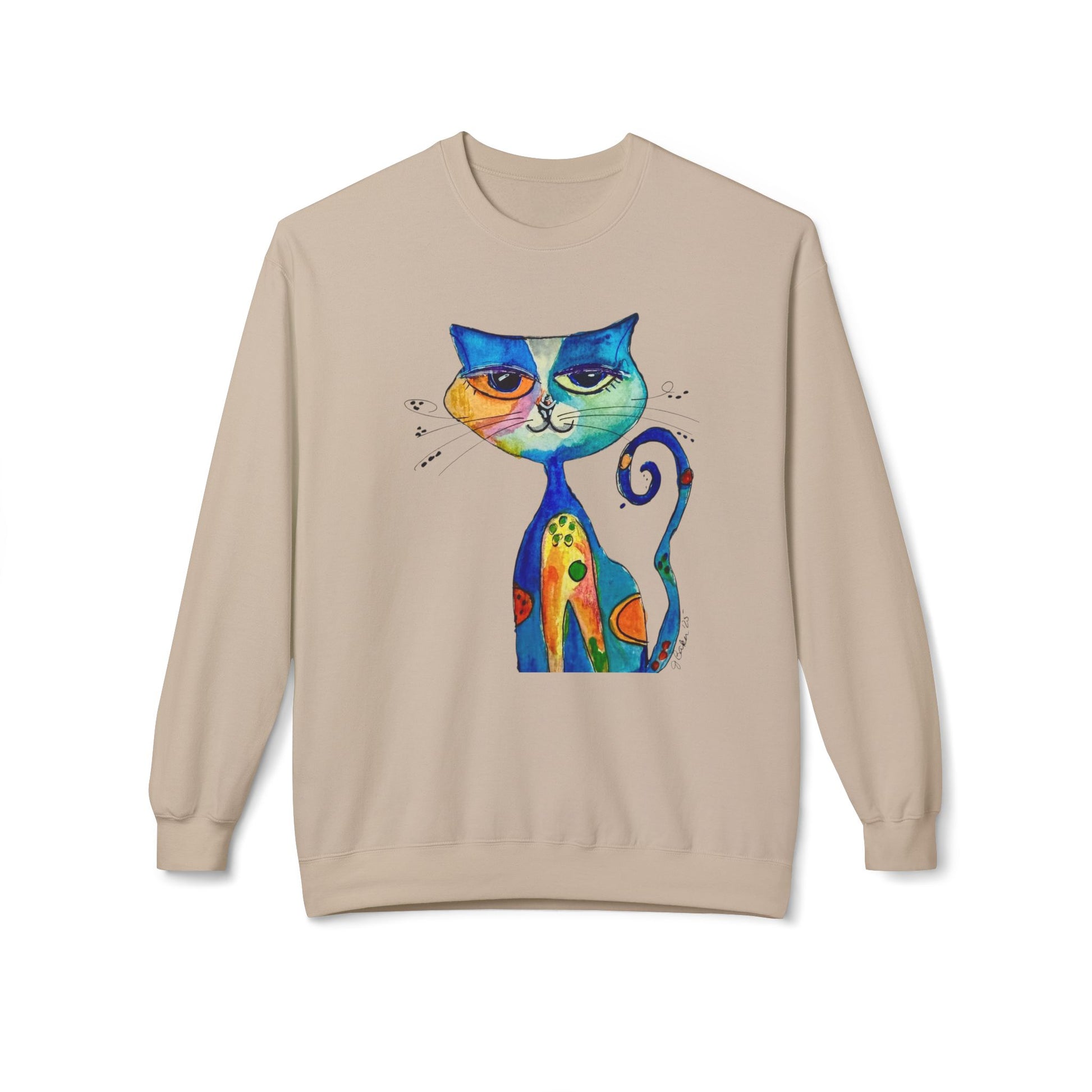 Slide this midweight crew over your shoulders and let the colorfully curious cat do the talking. The bright, painterly cat print brings a playful, artsy energy to a cozy, structured sweatshirt — the kind you reach for on slow mornings, gallery visits, or evening walks when you want warmth without stiffness. The dropped shoulders and classic fit create an easy, lived-in silhouette that layers smoothly over tees or under a coat. Soft ring-spun cotton and a reassuringly dense knit give it a plush hand; ribbed cuffs and hem hold shape while the tubular construction keeps lines clean. Wear it to add a cheerful, creative note to your weeknight routine or to bring a splash of color to low-key gatherings and relaxed studio days.