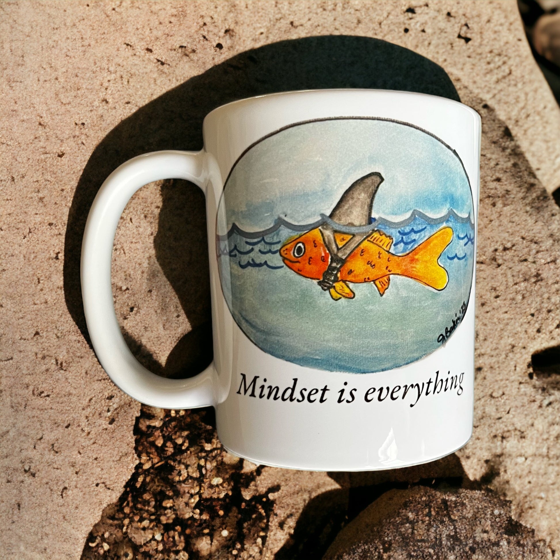 This 11 oz ceramic mug features the empowering phrase "Mindset is Everything" in bold, elegant typography. Adorning the design is a whimsical illustration of a goldfish confidently donning a shark costume, emphasizing the theme of determination and confidence. The goldfish-turned-shark symbolizes the potential within us all, reminding us that our mindset holds the key to achieving our goals. This high-quality, dishwasher-safe mug is perfect for those seeking motivation and a touch of playful inspiration in their daily routine.