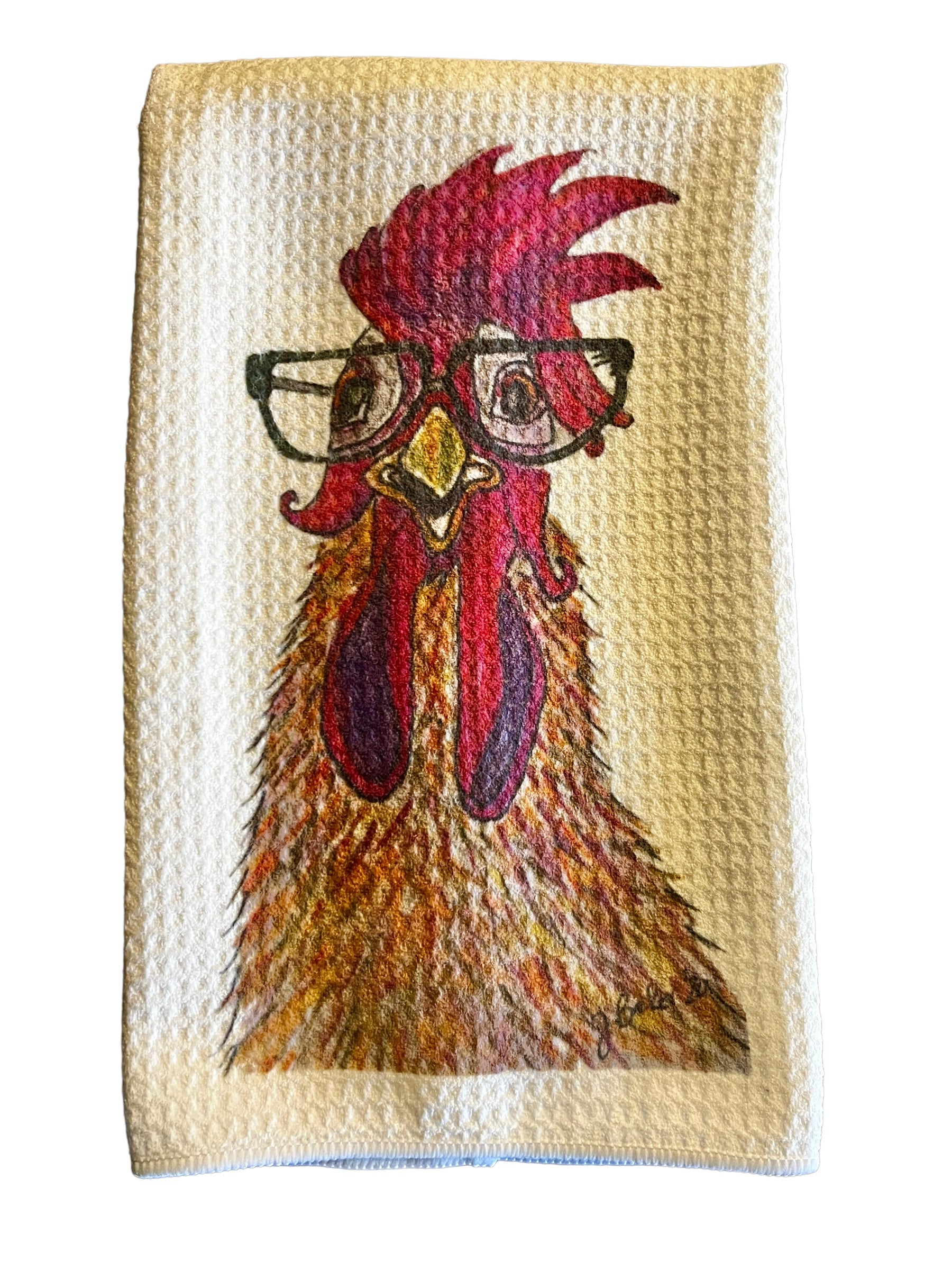 "Add some whimsy to your kitchen with this 16 x 24 rooster dish towel. Perfect for drying dishes or wiping up spills, this towel brings a splash of fun to your chores. Upgrade your kitchen essentials with this quirky addition!"Soft and absorbent waffle knit kitchen towel. Based on original watercolor artwork.