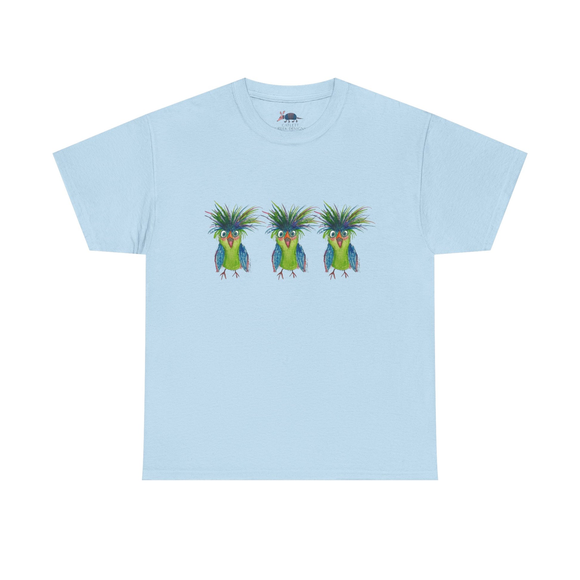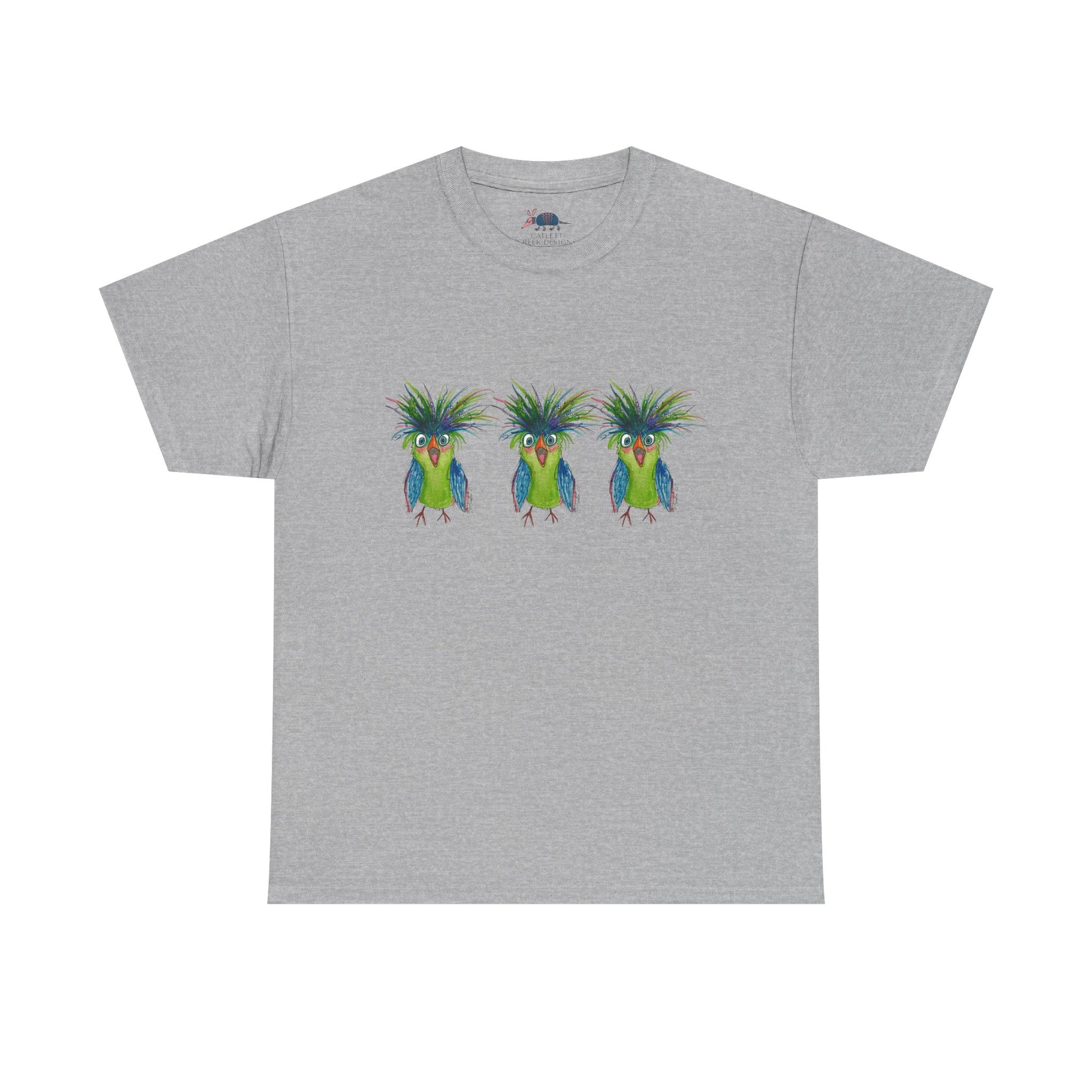 Soft, breathable tee featuring a playful trio of vividly colored birds across the chest. The design reads like a little island moment — jaunty crests, lush greens and blues, and a hand-illustrated feel that brings a relaxed, sunny energy to everyday wear. Lightweight yet durable, the shirt keeps its shape wash after wash and sits comfortably with a classic crew neckline. Wear it to bring a bright, whimsical note to coffee runs, weekend markets, or laid-back beach walks.